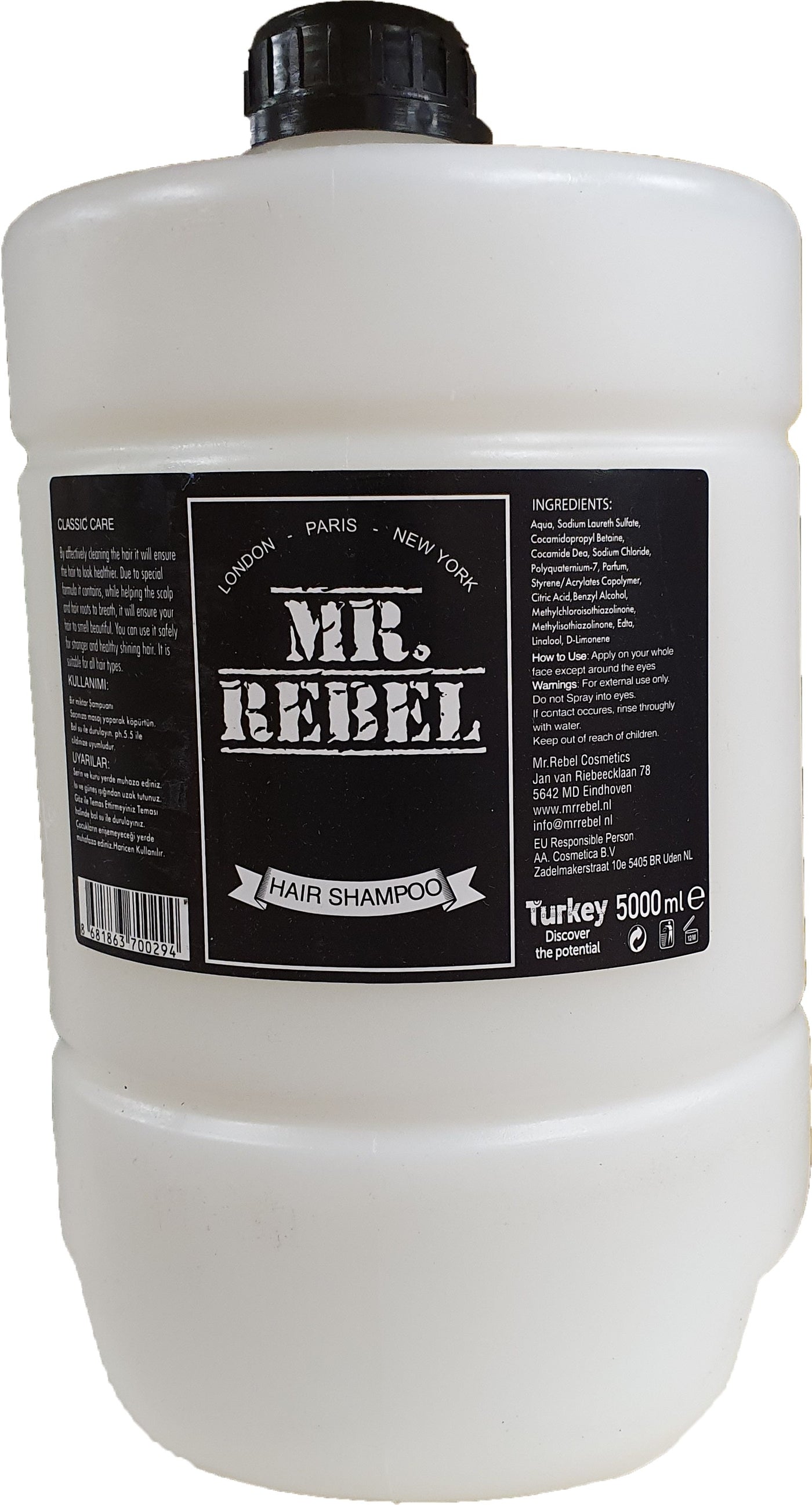 {"id":6053290016977,"title":"Mr Rebel Hair Shampoo 5 liter","handle":"mr-rebel-hair-shampoo-5-liter","description":"\u003cp\u003eMr Rebel Hair Shampoo 5 liter: by effectively cleaning the hair it will ensure the hair to look healthier. Due to special formula it contains, while helping the scalp and hair roots to breath, it will ensure your hair to smell beautiful. You can use it safely for stronger and healthy shining hair. It suitable for all hair types\u003c\/p\u003e","published_at":"2025-06-23T22:00:04+02:00","created_at":"2021-02-20T08:04:40+01:00","vendor":"Sky Cosmetics","type":"","tags":["HAAR SHAMPOO"],"price":1349,"price_min":1349,"price_max":1349,"available":true,"price_varies":false,"compare_at_price":null,"compare_at_price_min":0,"compare_at_price_max":0,"compare_at_price_varies":false,"variants":[{"id":37432362664145,"title":"Default Title","option1":"Default Title","option2":null,"option3":null,"sku":"34343433435","requires_shipping":true,"taxable":true,"featured_image":null,"available":true,"name":"Mr Rebel Hair Shampoo 5 liter","public_title":null,"options":["Default Title"],"price":1349,"weight":0,"compare_at_price":null,"inventory_management":"shopify","barcode":"535353533","requires_selling_plan":false,"selling_plan_allocations":[]}],"images":["\/\/www.kapperswinkel.eu\/cdn\/shop\/products\/9581.jpg?v=1613804680","\/\/www.kapperswinkel.eu\/cdn\/shop\/products\/8708.jpg?v=1613804680"],"featured_image":"\/\/www.kapperswinkel.eu\/cdn\/shop\/products\/9581.jpg?v=1613804680","options":["Title"],"media":[{"alt":"Mr Rebel Hair Shampoo 5 liter","id":14775520985297,"position":1,"preview_image":{"aspect_ratio":0.75,"height":577,"width":433,"src":"\/\/www.kapperswinkel.eu\/cdn\/shop\/products\/9581.jpg?v=1613804680"},"aspect_ratio":0.75,"height":577,"media_type":"image","src":"\/\/www.kapperswinkel.eu\/cdn\/shop\/products\/9581.jpg?v=1613804680","width":433},{"alt":"Mr Rebel Hair Shampoo 5 liter","id":14775521018065,"position":2,"preview_image":{"aspect_ratio":0.54,"height":2794,"width":1508,"src":"\/\/www.kapperswinkel.eu\/cdn\/shop\/products\/8708.jpg?v=1613804680"},"aspect_ratio":0.54,"height":2794,"media_type":"image","src":"\/\/www.kapperswinkel.eu\/cdn\/shop\/products\/8708.jpg?v=1613804680","width":1508}],"requires_selling_plan":false,"selling_plan_groups":[],"content":"\u003cp\u003eMr Rebel Hair Shampoo 5 liter: by effectively cleaning the hair it will ensure the hair to look healthier. Due to special formula it contains, while helping the scalp and hair roots to breath, it will ensure your hair to smell beautiful. You can use it safely for stronger and healthy shining hair. It suitable for all hair types\u003c\/p\u003e"}