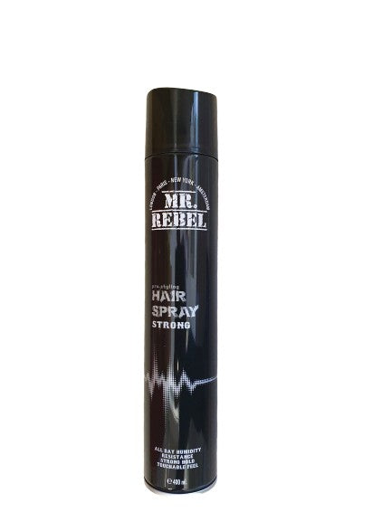 Mr Rebel Hair Spray Strong 400 ml: protects your hair style under any season and air conditions thanks to its enhanced strong formula. Gives shine and vigor to your hair thanks to tis contents.