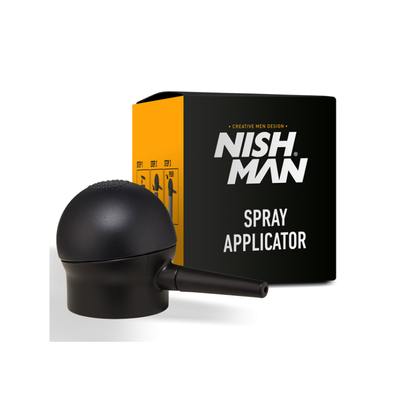 Nishman Spray Applicator: De applicator zorgt er voor dat de haarvezels gericht worden aangebracht op de dunner wordende hoofdhuid en baard. Gebruiksaanwijzing: Verwijder de dop van de Hair Fiber poeder bus en de film laag. Draai de applicator op de bus en verwijder het dopje van het tuitje Vervolgens druk je op de bovenkant van de pomp om de hoeveelheid te doseren, gericht op het dunner wordend haar.